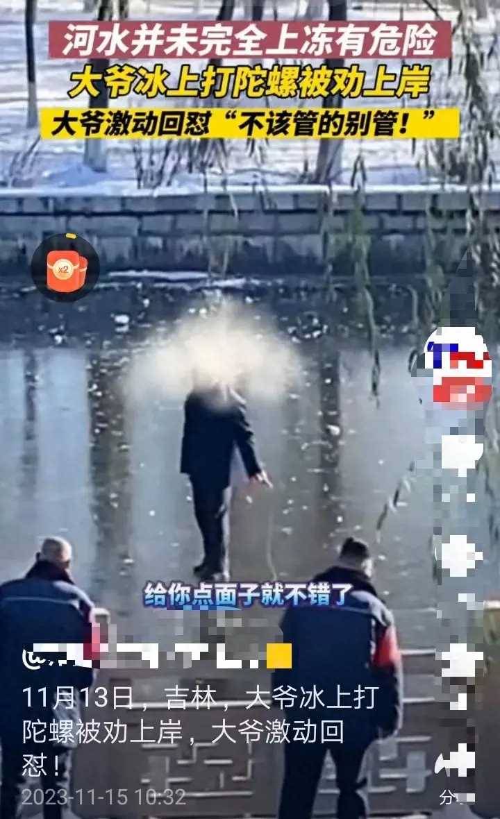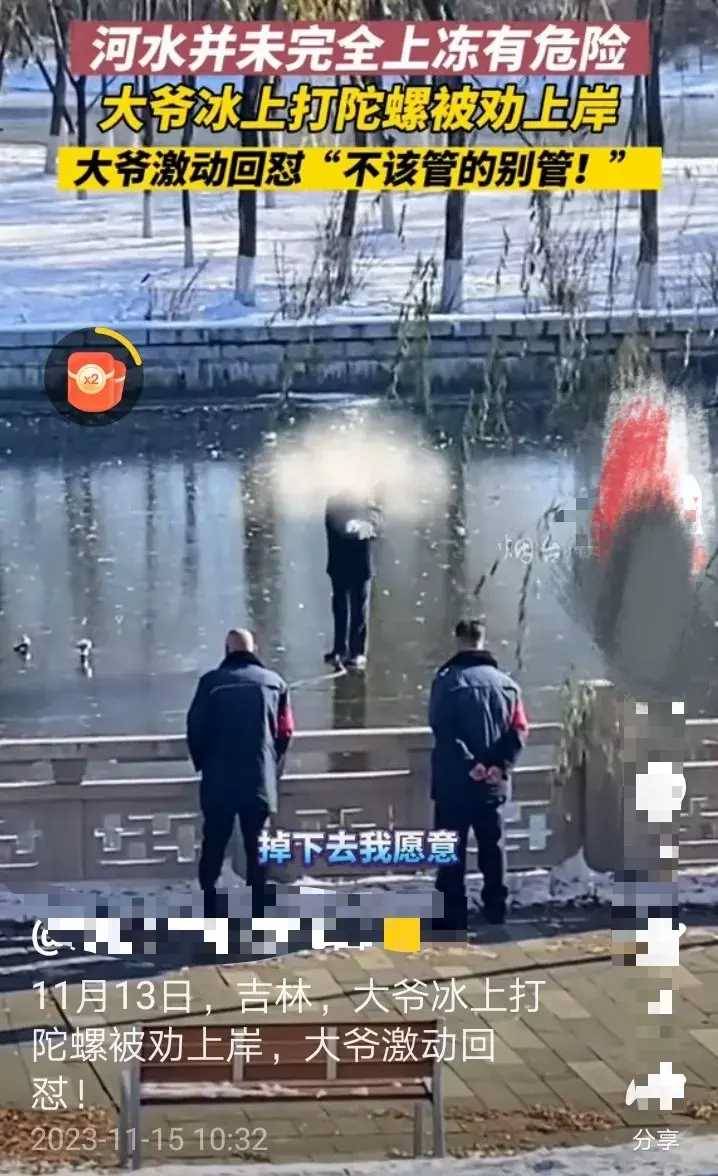 11月13日,吉林一大爺在河面冰上玩陀螺,有保安勸說大爺:「現在河面剛剛結冰,很不安全,有掉下去的風險,為了安全還是別玩了!」沒想到卻被大爺狂懟:「不該管的你瞎**管啥啊,給你點面子就不錯了,趕緊走你的,我就不上去,掉下去我愿意。」